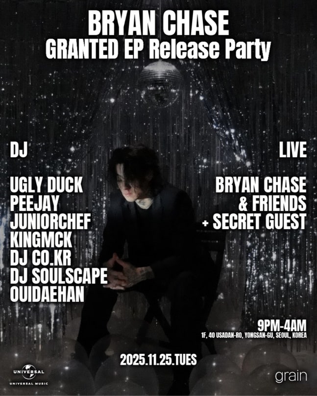 브라이언 체이스가 오는 25일 서울 ‘그레인 하우스’에서 새 EP ‘GRANTED’ 발매 기념 릴리즈 파티를 개최한다. 이 자리에는 소울스케이프, 피제이, 주니어셰프 등 유명 DJ들이 함께하며, 팬들과 동료 아티스트들이 모여 잊지 못할 시간을 보낼 예정이다. 새 EP에는 타잔이 피처링한 ‘FOR GRANTED’를 포함해 총 3곡이 수록되어 있으며, 닉 스파이더스와 글레스이어가 참여해 현대적인 사운드를 완성했다.