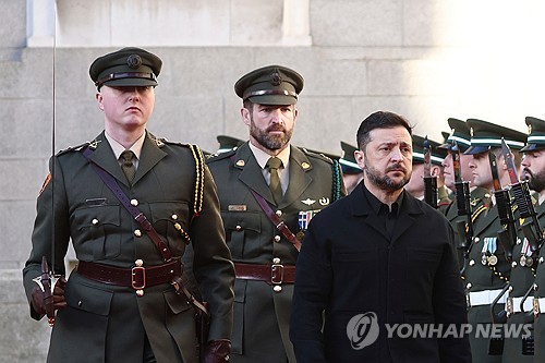 우크라이나의 대통령 볼로디미르 젤렌스키가 아일랜드 더블린의 정부 청사에서 마이클 아일랜드 총리를 방문하며 경호대를 점검하는 모습이 포착됐다. 이 만남은 양국 간의 관계를 더욱 강화하는 중요한 계기가 될 것으로 기대된다.