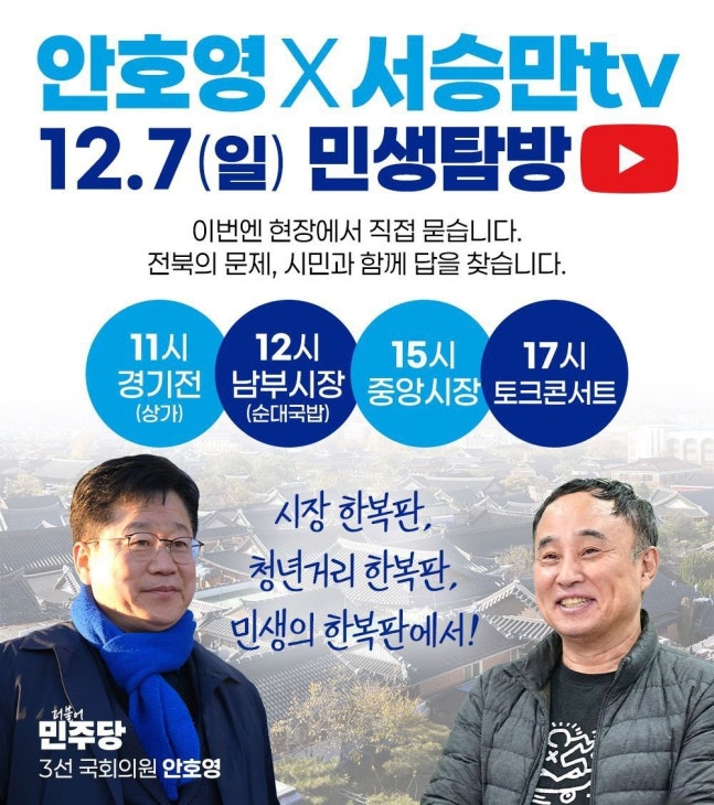 더불어민주당의 안호영 의원이 12월 7일 '서승만 TV'와 함께 전주 주요 상권을 순회하며 시민들의 민생 문제를 직접 듣는 '민생탐방'을 실시한다. 이번 탐방은 정치가 현장에서 시민과 소통해야 한다는 취지로 기획되었으며, 경제난과 청년 일자리 문제 등 지역의 다양한 과제를 논의할 예정이다.