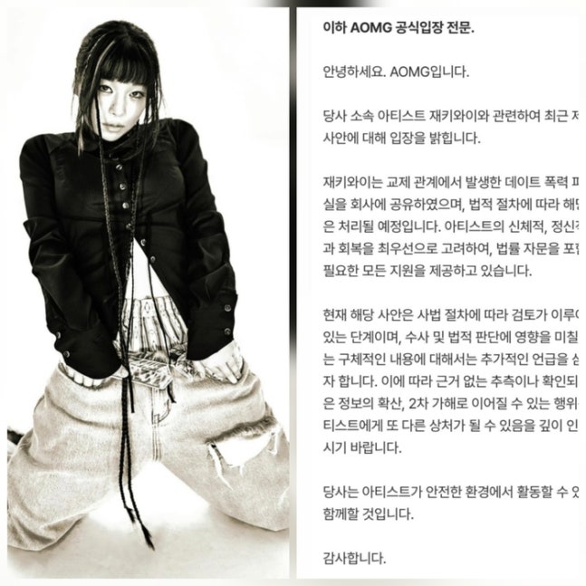 #3 재키와이, 데이트 폭력 피해 사실 확인…AOMG 법적 대응 예고