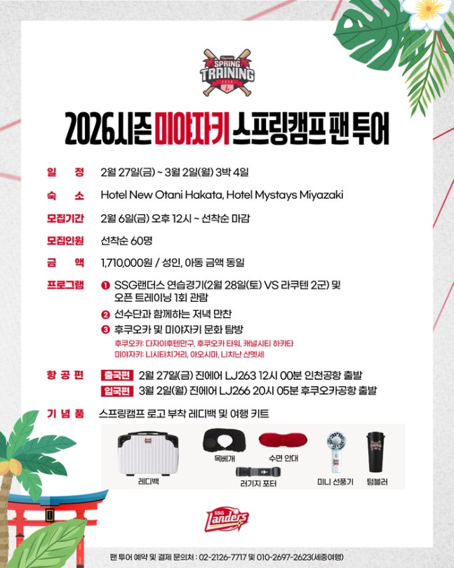 SSG가 2026시즌 미야자키 스프링캠프 팬투어 참가자를 모집한다고 발표했다. 모집은 6일 오후 12시부터 시작되며, 올해는 인원을 전년 대비 2배 늘려 총 60명을 선발할 예정이다. 팬들은 3박 4일 동안 미야자키와 후쿠오카를 여행하며 다양한 프로그램에 참여할 수 있는 기회를 갖게 된다.