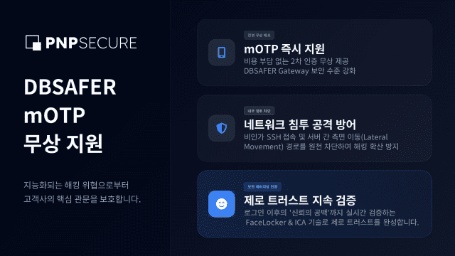 피앤피시큐어가 고객사의 보안을 강화하기 위해 자사의 접근제어 솔루션 'DBSAFER'의 모바일 일회용 패스워드(mOTP)를 무상으로 제공한다고 발표했다. 이는 해킹과 개인정보 유출 사고가 빈번해짐에 따라 고객사들이 2차 인증을 도입하는 데 있어 비용과 절차의 부담을 덜어주기 위한 조치로, 보안 관리자의 계정 탈취 공격을 효과적으로 차단할 수 있는 방안으로 주목받고 있다.