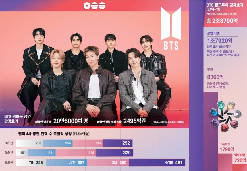 이번 공연은 단순한 컴백을 넘어 K팝 산업의 새로운 변화를 상징한다. 김도헌 음악평론가는 'BTS는 K팝을 세계적인 문화로 격상시킨 주역'이라며, 이번 공연이 K팝의 복합 산업으로의 진화를 보여준다고 강조했다. BTS의 컴백으로 인해 월드투어와 관련된 직접적인 매출이 2조9000억원에 이를 것으로 보이며, 외국인 팬들의 소비 지출도 2500억원에 달할 것으로 예상된다.