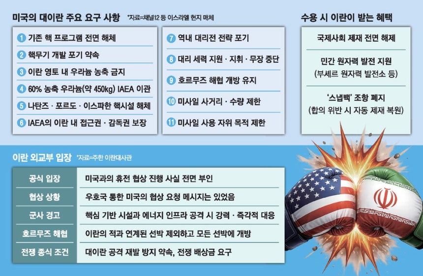 트럼프 대통령은 이란과의 협상에서 핵무기 포기를 최우선 조건으로 내세우며, 현재 협상이 진행 중이라고 밝혔다. 그는 이란의 새 지도부가 실권을 갖고 있다는 점을 강조하며, 미국의 요구 조건이 15개 항목으로 구성되어 있다고 전했다. 이란 측은 미국과의 협상 사실을 부인하고 있지만, 미국은 중동 지역에 병력을 증파하며 압박 수위를 높이고 있다.