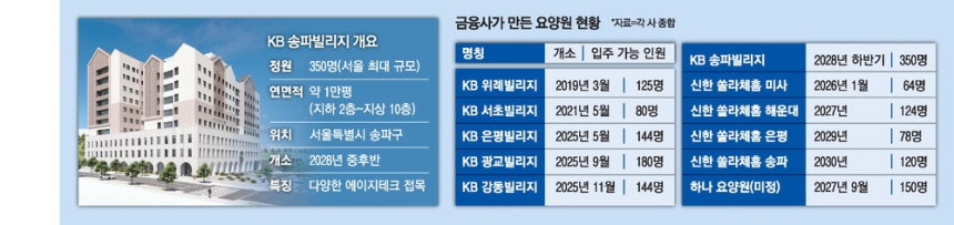 금융업계가 요양원 시장에 본격적으로 뛰어들며 경쟁이 치열해지고 있다. KB금융은 송파에 350명 규모의 대형 요양원 'KB 송파빌리지'를 2028년 개원 목표로 건립할 예정이다. 이는 서울에서 가장 큰 요양시설로 자리 잡을 전망이며, AI 기반의 스마트케어 시스템을 도입해 혁신적인 돌봄 서비스를 제공할 계획이다.