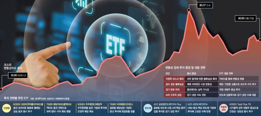 현재 국내 증시는 중동의 지정학적 리스크와 금리 불확실성으로 인해 큰 변동성을 겪고 있습니다. 이러한 상황에서 개인 투자자들은 상장지수펀드(ETF)를 통한 분산투자에 관심을 보이고 있으며, 안정성과 성장성을 동시에 추구하는 중장기 포트폴리오 구축이 중요하다는 조언이 나오고 있습니다. 대형 자산운용사들은 인컴형 자산과 반도체 우량주를 중심으로 한 ETF 전략을 추천하며, 변동성에 대응하기 위한 다양한 접근법을 제시하고 있습니다.