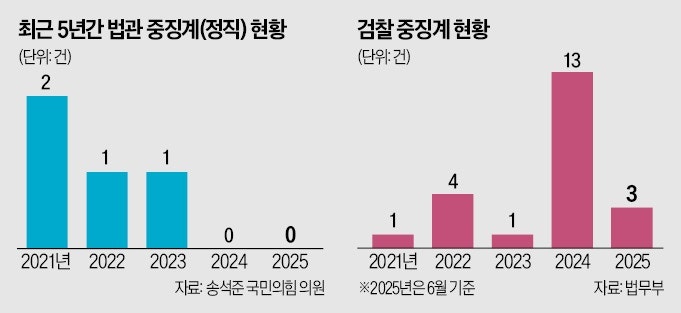대법원 법원행정처의 자료에 따르면, 2021년부터 올해 3월까지 법관 징계는 총 9건에 불과하며, 정직 이상의 중징계는 전무하다. 반면, 검찰의 중징계는 급증하고 있어 법원과 검찰 간의 징계 추이에 큰 차이가 나타나고 있다. 이러한 상황은 법원 내부의 감찰 시스템 붕괴와 관련이 깊다.